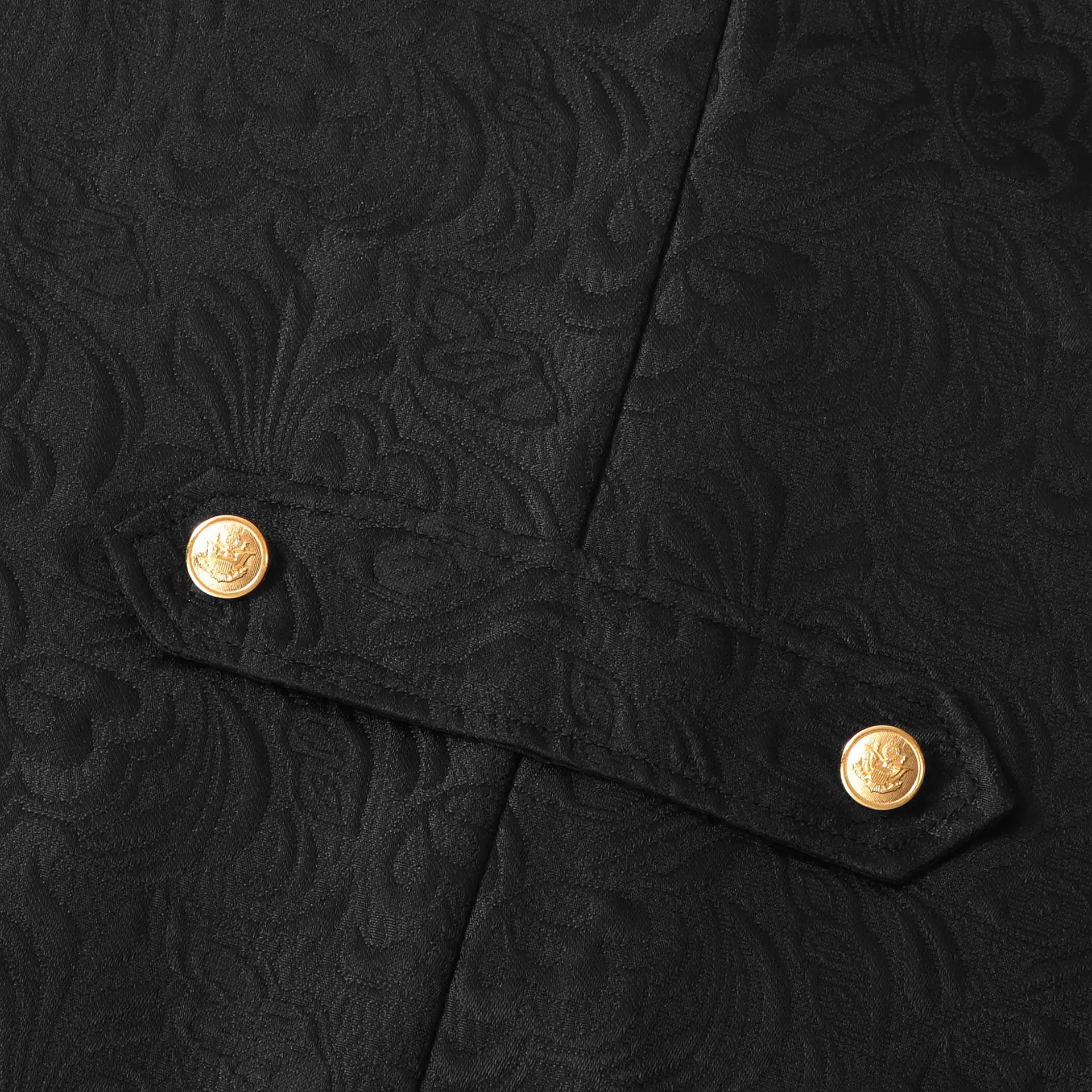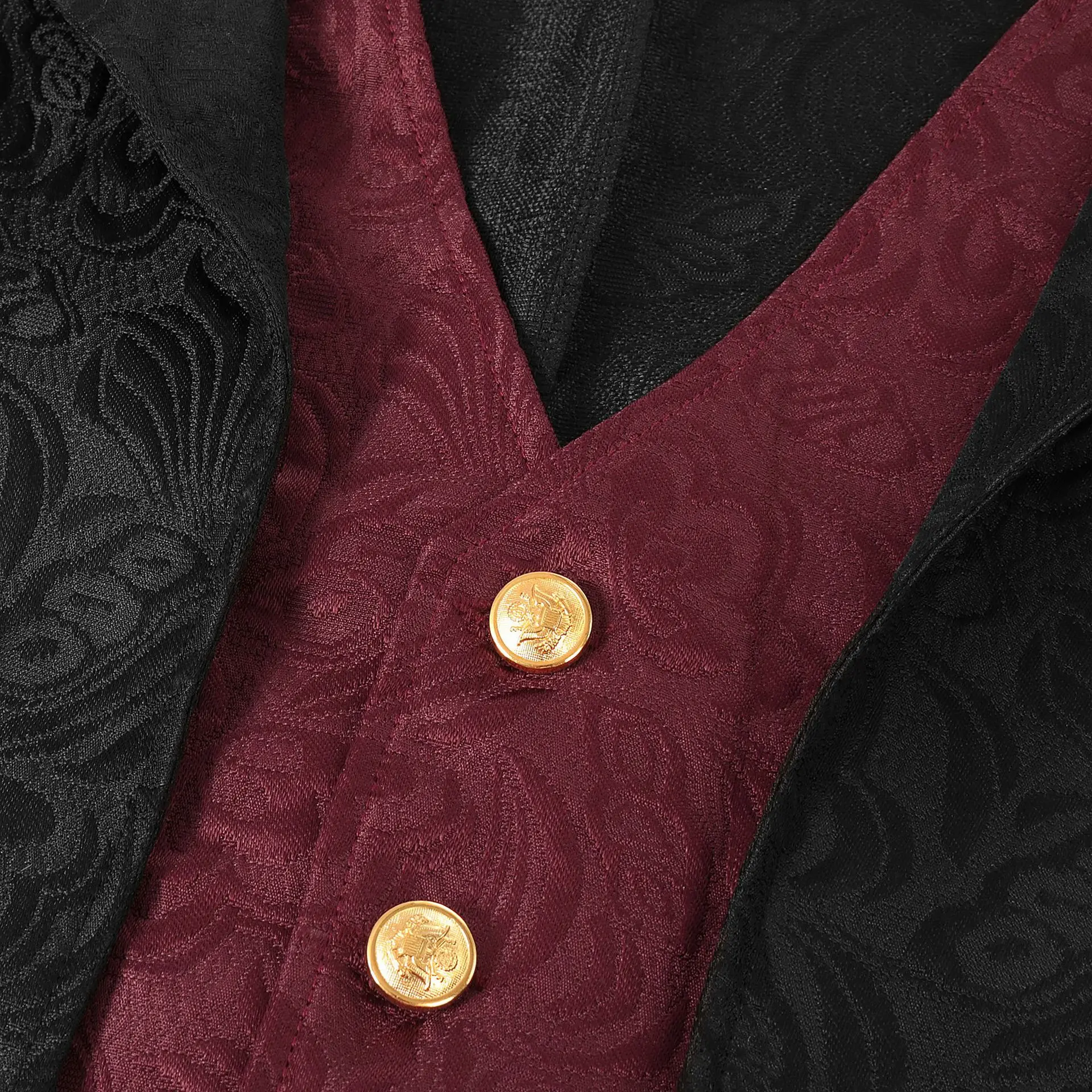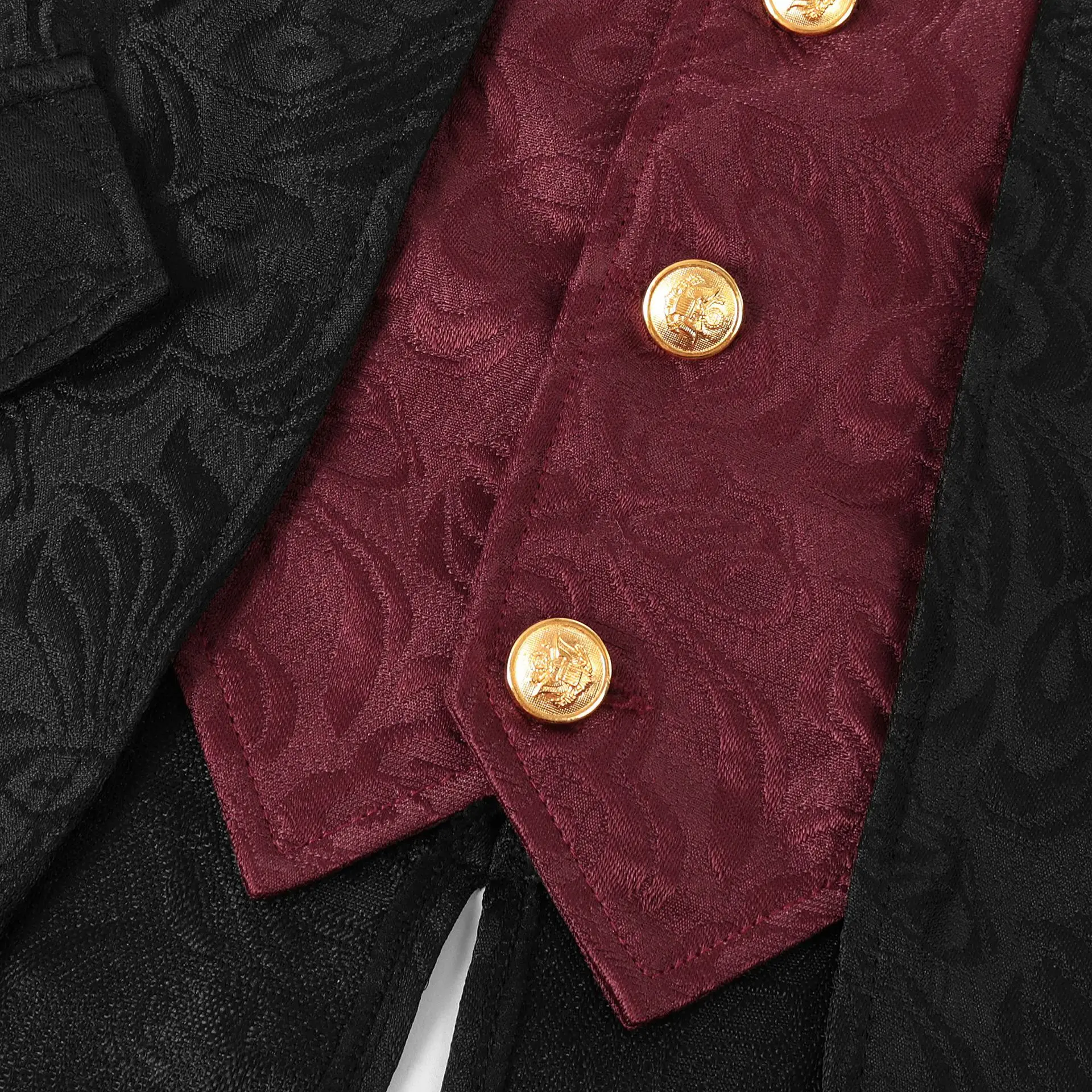 Made from lightweight polyester with ornate brocade-style texture and decorative gold-tone buttons, it features long coat tails and an attached faux vest front for a layered look without the bulk. Available in three bold colors: burgundy, royal blue, and white.