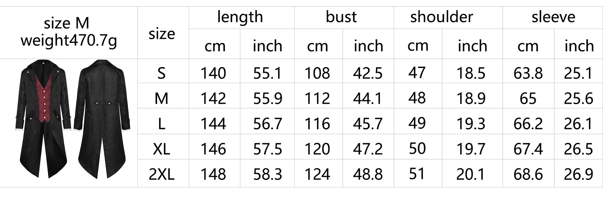 Level up your garb game with this affordable and eye-catching steampunk tailcoat, perfect for cosplay, Renaissance faires, vampire costumes, and fantasy events. Designed for all-day comfort and dramatic flair, this men’s Victorian-style jacket brings aristocratic vibes to any look — whether you’re a vampire lord, airship captain, or LARP noble.