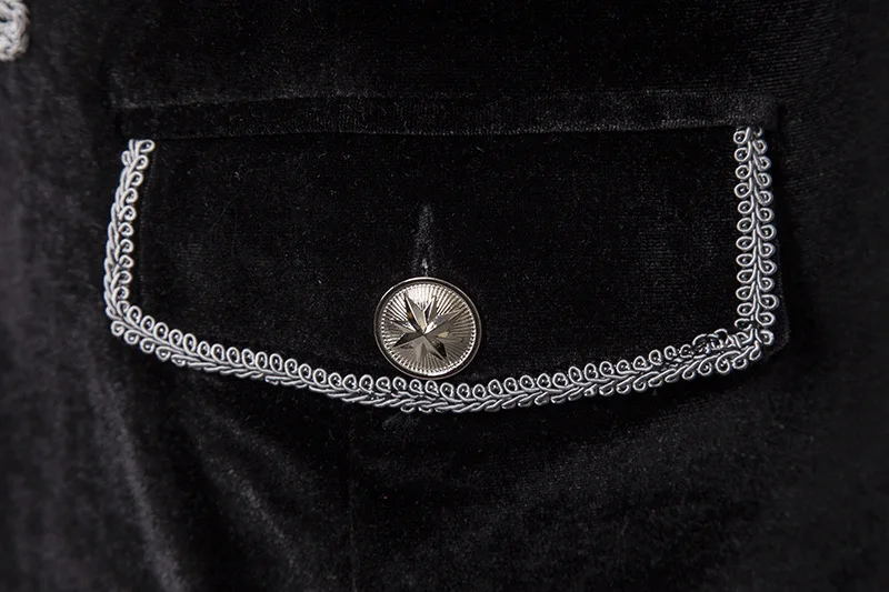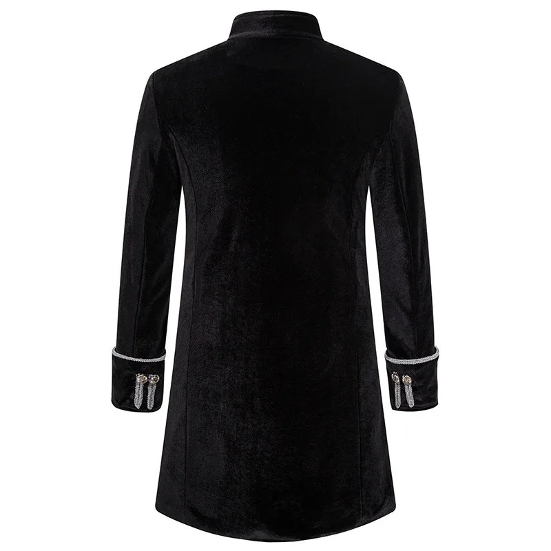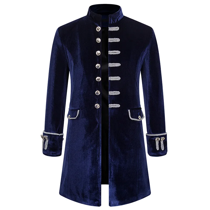 Design Features: Silver button accents, silver trim detail on cuffs and chest, high collar